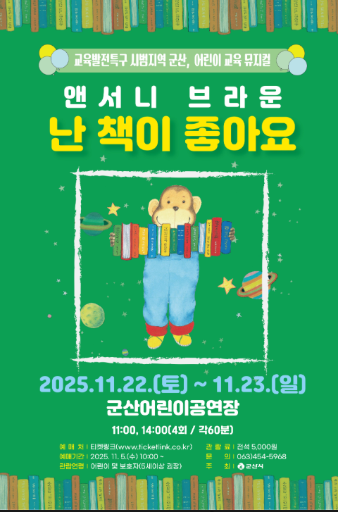 군산시는 오는 22일~23일 이틀간 세계적인 그림책 작가 앤서니 브라운의 작품을 원작으로 한 교육뮤지컬 ‘난 책이 좋아요’를 선보인다. 공연과 함께 헌책·폐건전지를 수거하는 ‘ON 캠페인’이 함께 열리며, 문화·나눔·환경을 아우르는 따뜻한 무대가 될 것으로 기대가 모아진다.