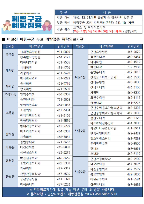 아직 접종하지 않은 1960년생(주민등록상 1960년 12월 31일 이전 출생)시민은 주소지와 관계없이 신분증을 지참하여 군산시 보건소 또는 가까운 지정 의료기관을 방문하면 23가 다당 백신(PPSV23)을 1회 무료로 접종받을 수 있다.