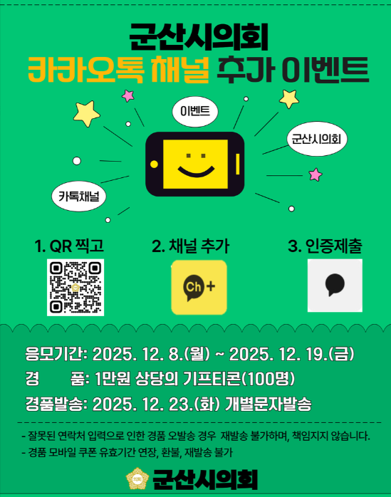 이번 이벤트는 군산시의회 공식 카카오톡 채널을 통해 의정 활동 소식을 보다 신속·편리하게 제공하고, 시민들이 의정 정보를 쉽게 받아볼 수 있도록 기획됐다.