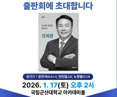 진희완 군산시장 출마예정자가 오는 17일(토) 오후 2시, 국립군산대학교 아카데미홀에서 저서 ‘진희완, 군산의 내일을 비추다’ 출판을 기념한 북콘서트를 개최한다.