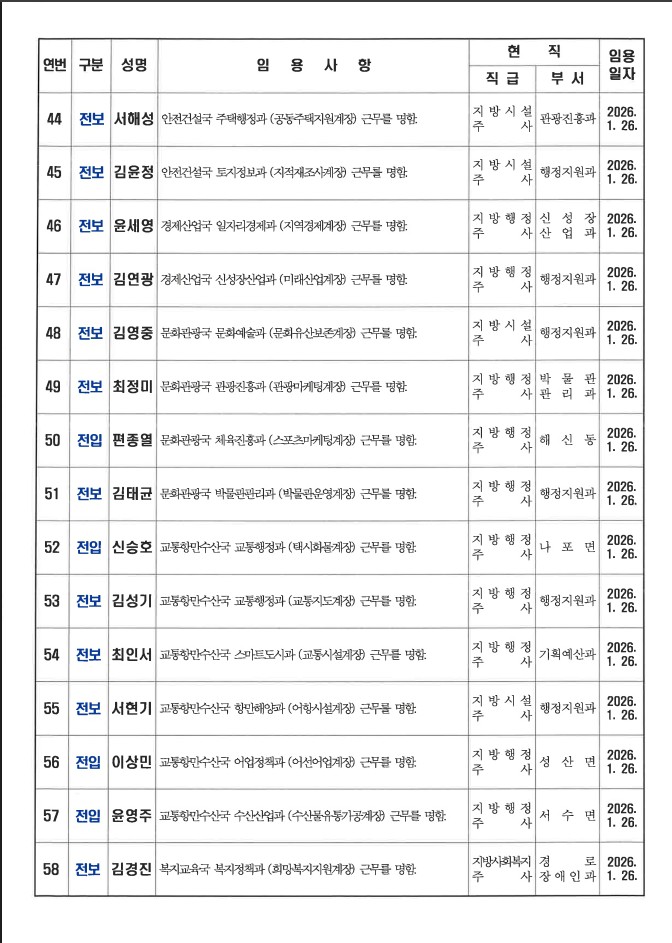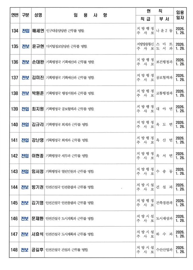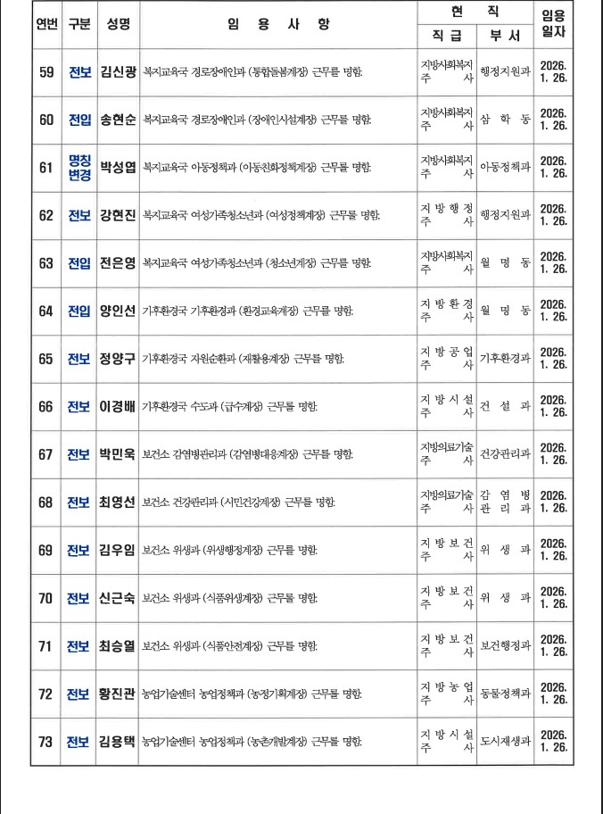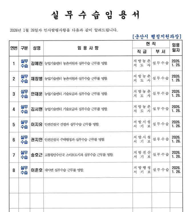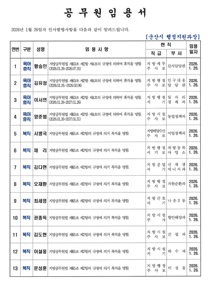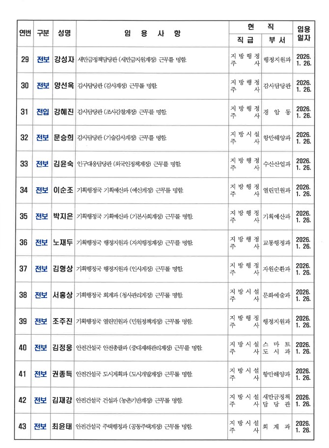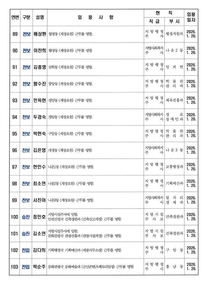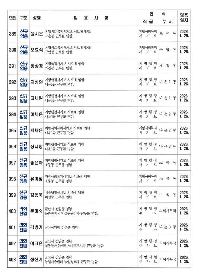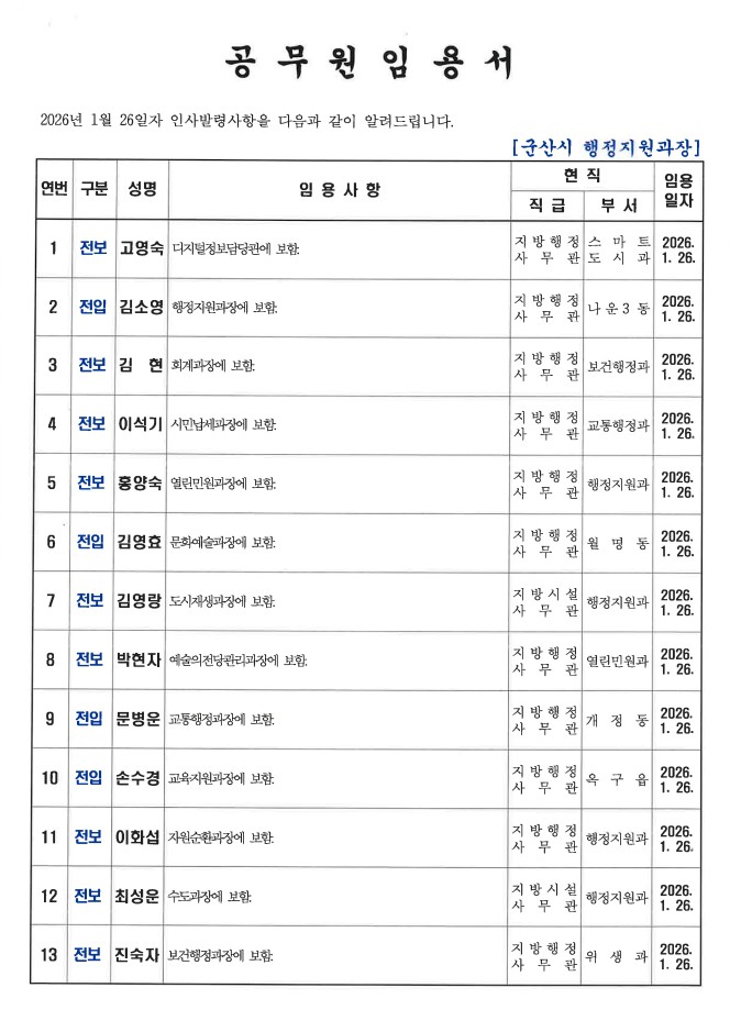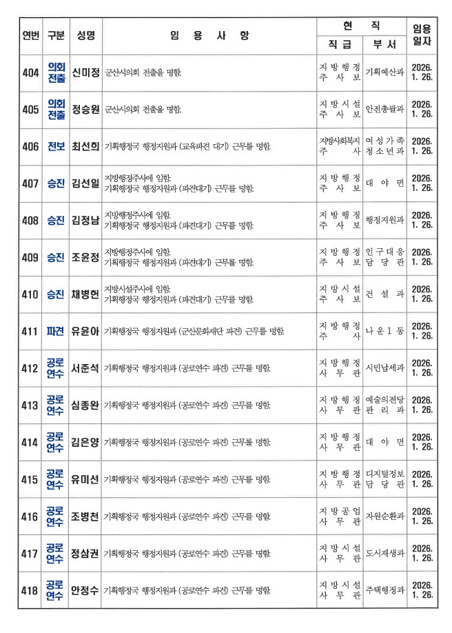 군산시가 1월 26일자 상반기 정기인사를 발표했다. 인사명단은 다음과 같다.