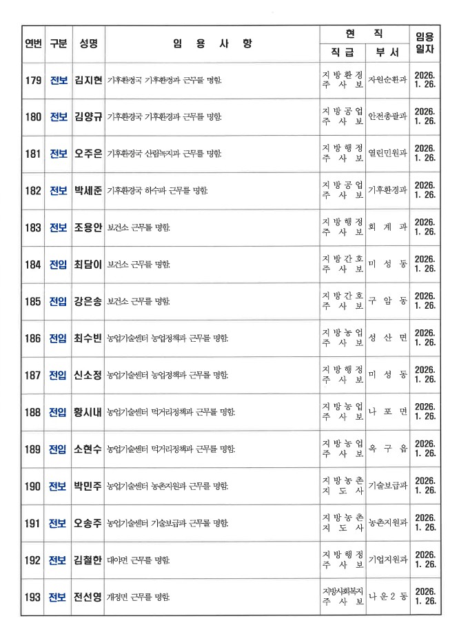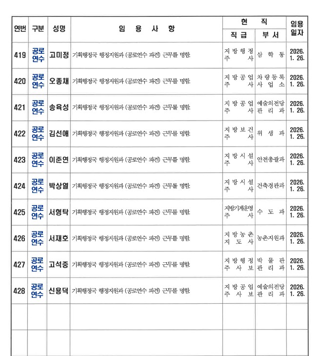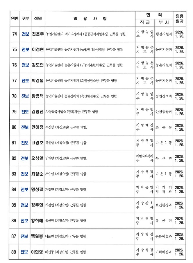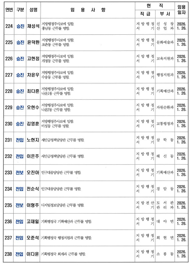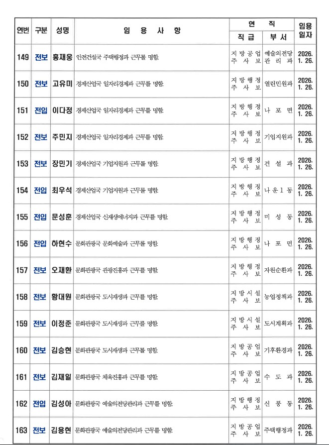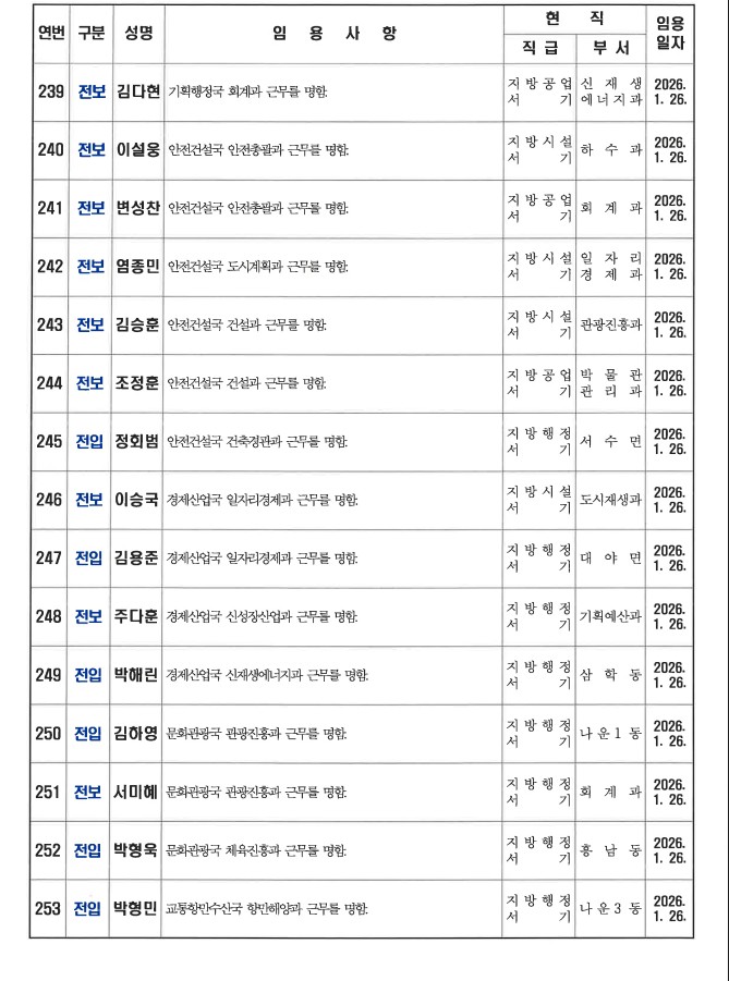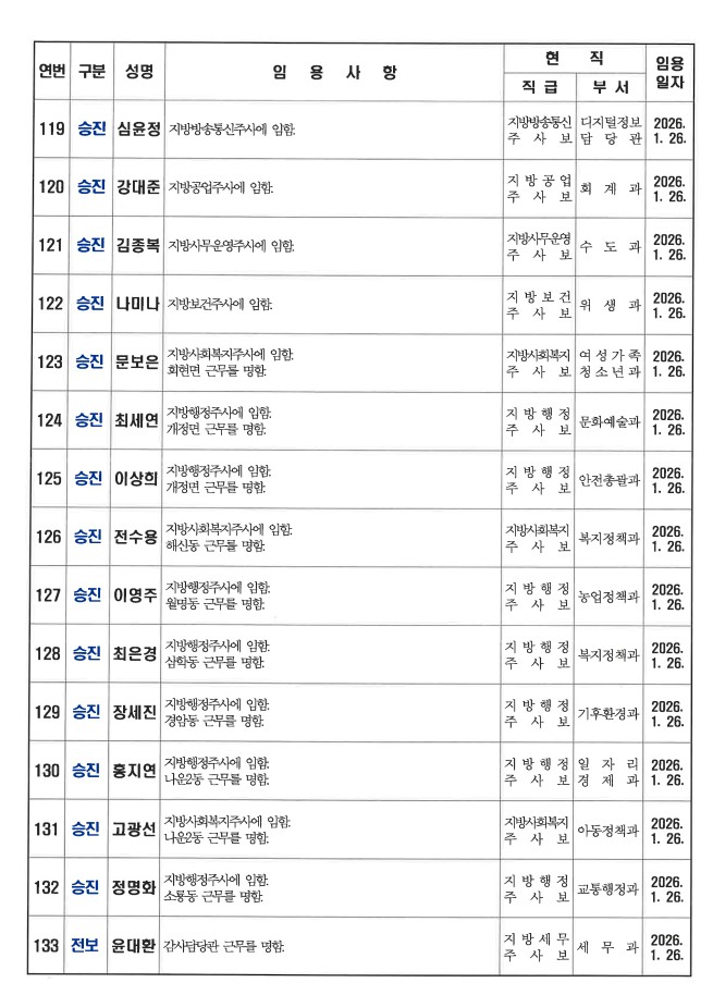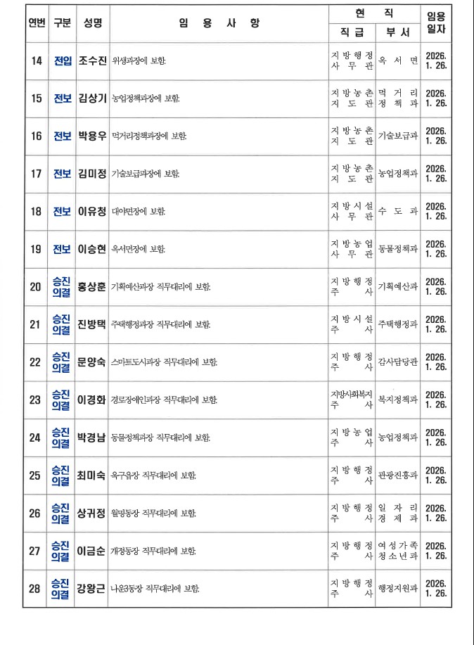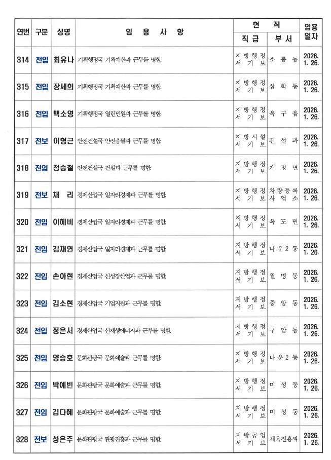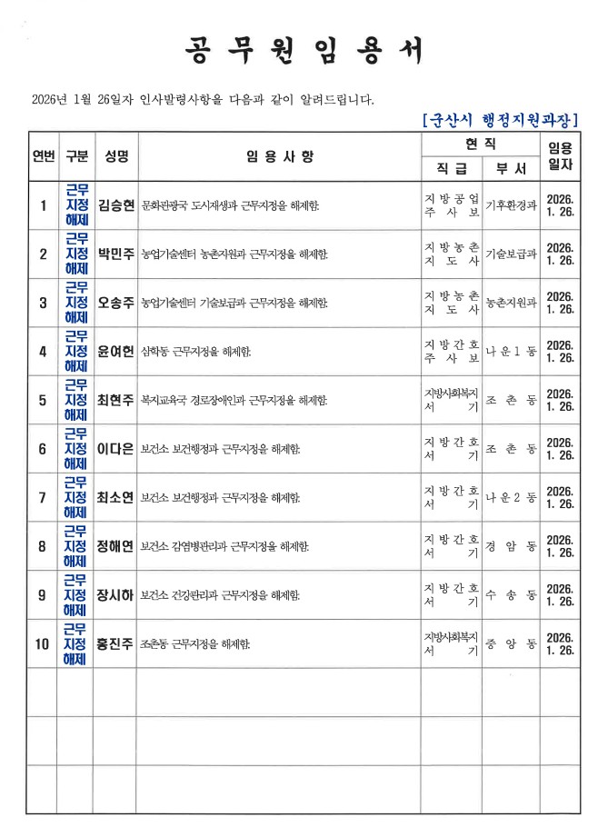 군산시가 1월 26일자 상반기 정기인사를 발표했다. 인사명단은 다음과 같다.