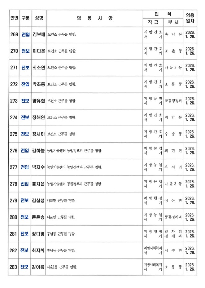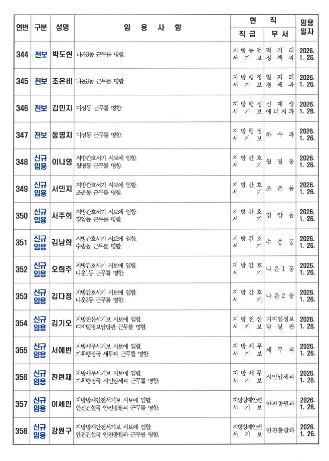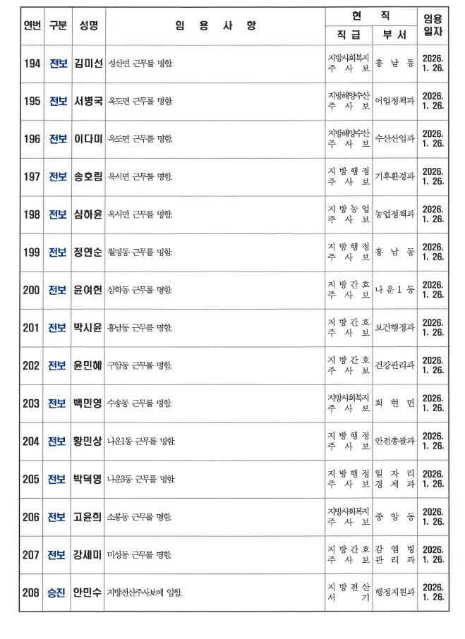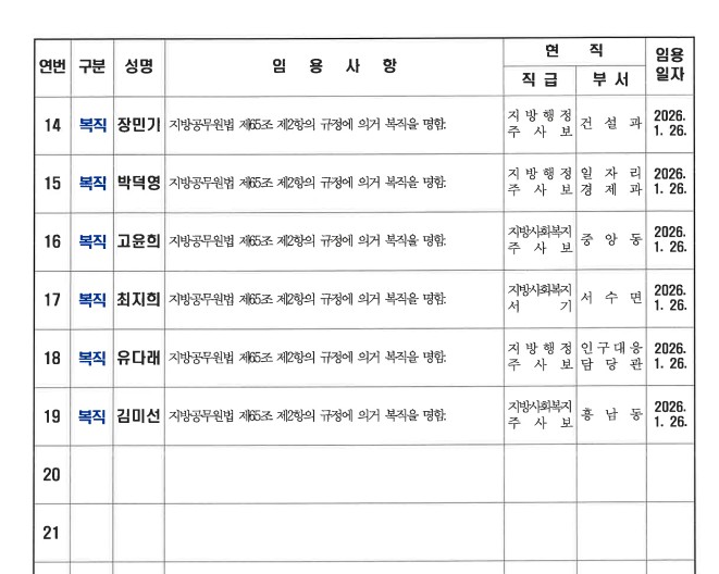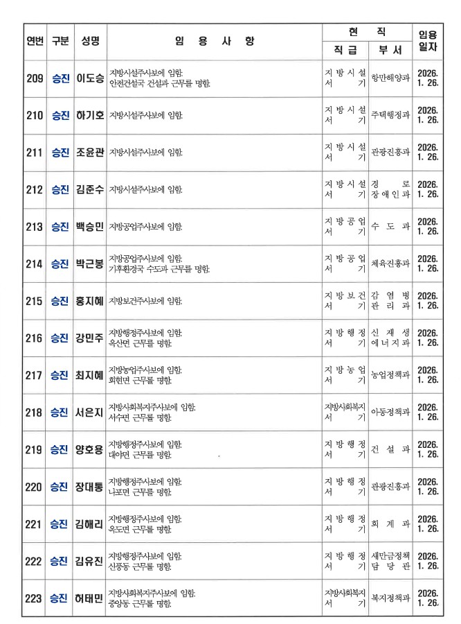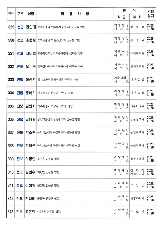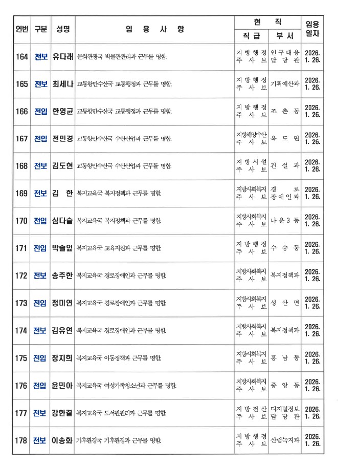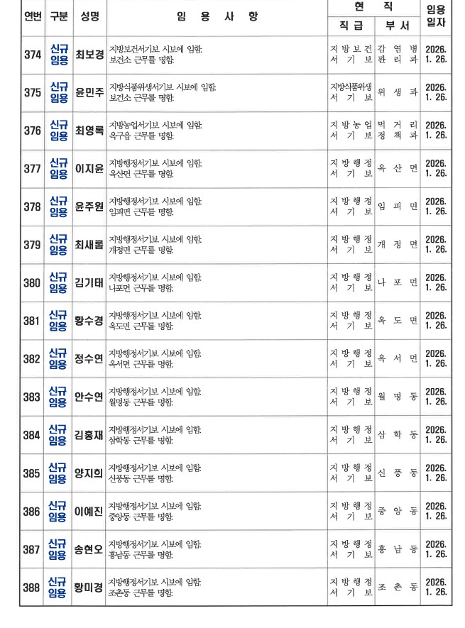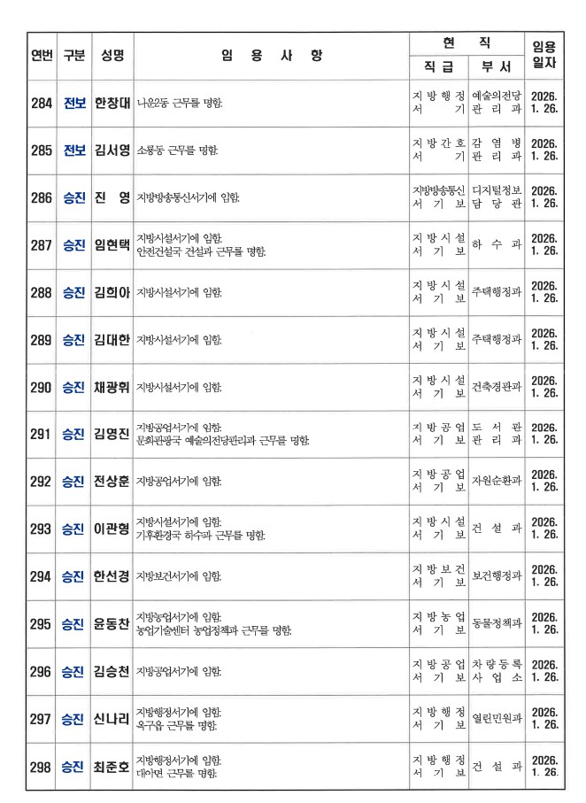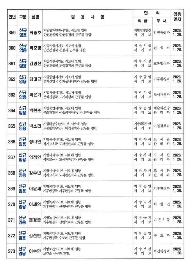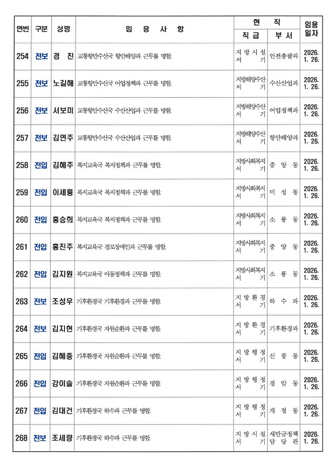 군산시가 1월 26일자 상반기 정기인사를 발표했다. 인사명단은 다음과 같다.