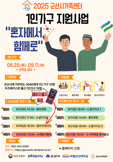 참여를 원하는 군산 거주 30~40대 1인 가구와 우즈베키스탄 출신 외국인 근로자는 선착순으로 모집하며, 군산시가족센터(443-5300)로 문의하면 신청할 수 있다.