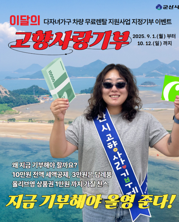 군산시가 9월 1일부터 10월 12일까지 ‘군산시에 고향사랑기부하고 14만 원 혜택 받기’ 이벤트를 진행한다. 참여자는 다자녀가구 차량 무료 렌탈 지원사업에 10만 원 이상 기부하면 연말정산 세액공제와 30% 상당의 답례품을 받을 수 있으며, 100명을 추첨해 올리브영 1만 원 상품권도 제공한다.