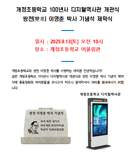 군산시 개정면에 위치한 개정초등학교가 개교 100주년을 맞아 오는 13일(토) 오전 10시, ‘개정초등학교 100년사 디지털 역사관 개관식’과 ‘쌍천(雙泉) 이영춘 박사 기념석 제막식’을 개최한다.
