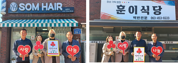 군산시 성산면의 ‘쏨헤어(대표 조하솜)’와 ‘훈이식당(대표 조창열)’이 착한가게 릴레이에 새롭게 참여했다. 두 업소는 지역 어르신과 어려운 이웃을 위한 정기 후원에 동참하며 각각 17호점과 18호점으로 이름을 올렸다.