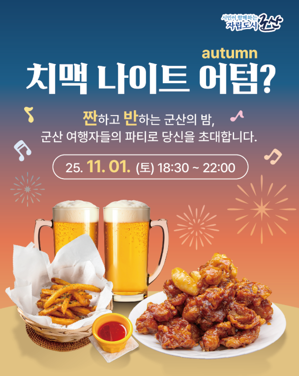 가을밤의 낭만을 제대로 즐기고 싶다면, 이번엔 군산으로 떠나보자. 군산시가 오는 11월 1일 저녁, 탁 트인 내항 일원에서 ‘치맥나이트 어텀(Autumn)?’을 마련했다. 치킨과 맥주, 그리고 음악이 어우러진 이색 야간 축제가 깊어가는 가을밤을 흥겹게 물들일 예정이다.
