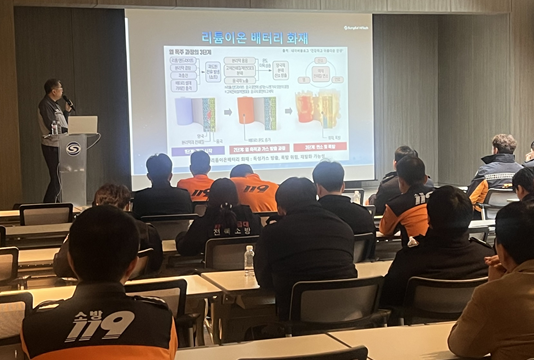특강은 손현태 강사가 진행했으며, ▲이차전지의 작동 원리 ▲배터리 유형별 구조와 특성 ▲열폭주를 비롯한 주요 위험요인과 사고 메커니즘 ▲화재·폭발 대응 전략 ▲재원 구성과 진압 방법 등 전문적인 내용이 체계적으로 다뤄졌다. 특히 실제 현장에서 발생한 사고 사례 분석을 통해 신속한 대응 절차와 안전 확보 방안도 함께 제시됐다.
