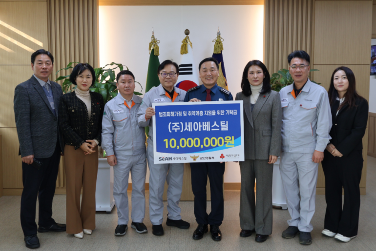 세아베스틸은 2023년을 시작으로 매년 1,000만 원씩을 기부해오고 있으며, 전북사회복지공동모금회를 통해 한 가정당 100만 원씩 총 30가정에 3,000만 원의 지원을 지속하고 있다. 올해도 역시 1,000만 원을 지정 기탁했으며, 이 지원금은 군산경찰서가 추천한 범죄피해가정 및 취약계층에게 맞춤형으로 전달될 예정이다.
