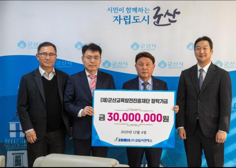 해상풍력 기자재 생산을 주력하는 ㈜삼일씨엔에스(유청무 대표 외 2명)가 군산교육발전진흥재단에 장학금 3,000만 원을 기탁하며 지역 인재 육성을 위한 뜻깊은 나눔에 동참했다.