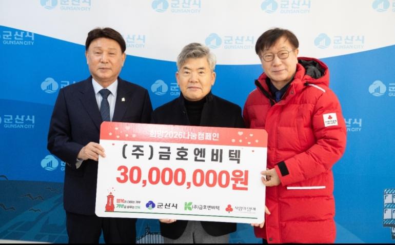 ㈜금호엔비텍(대표 이지태)은 6일 이웃돕기 성금 3,000만 원을 군산시에 기탁하고, 사랑의열매 고액 기업 기부 프로그램인 ‘나눔명문기업’에 가입했다고 밝혔다.