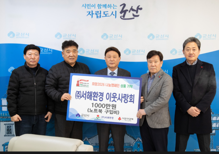 ㈜서해환경 이웃사랑회가 4일 군산시 저소득가정 대학 신입생을 위한 노트북 구입비 1,000만 원을 기탁하며, 청년들의 새로운 출발을 응원했다.