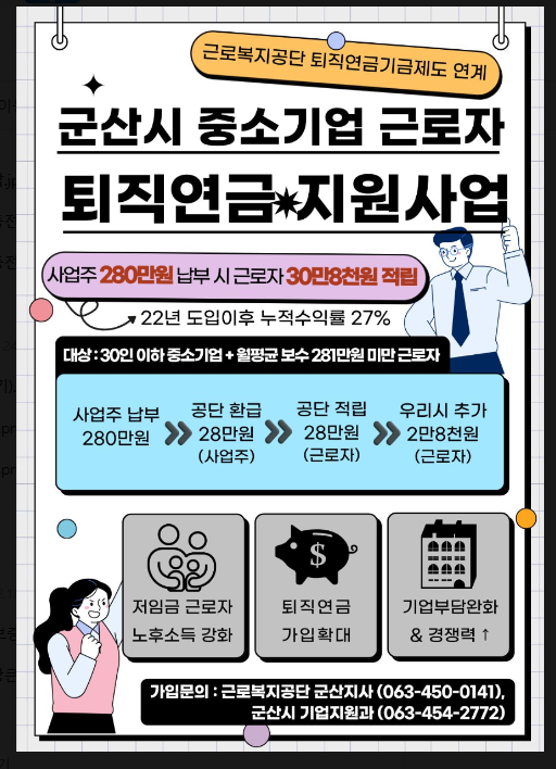 군산시는 근로복지공단의 중소기업 퇴직연금기금제도 ‘푸른씨앗’ 가입 사업장을 대상으로, 30인 이하 중소기업(소상공인 포함)에서 근무하는 전년도 월평균 보수 281만 원 미만 근로자가 지원 대상이다.