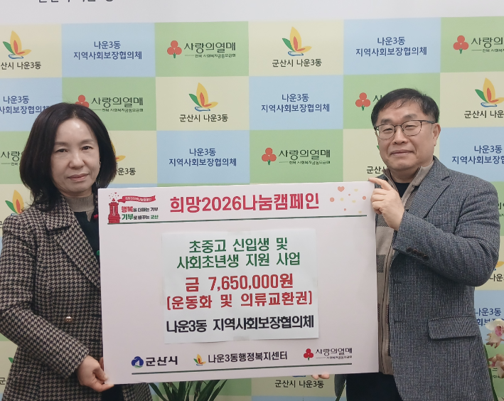 같은 날 나운3동 지역사회보장협의체(공공위원장 강왕근, 민간위원장 임진희)도 초·중·고 신입생 27명과 20세 사회초년생 12명에게 운동화 및 의류 교환권을 지원했다. 새 학기 준비와 사회 진출 과정에서 실질적인 도움이 될 수 있도록 마련된 사업이다.