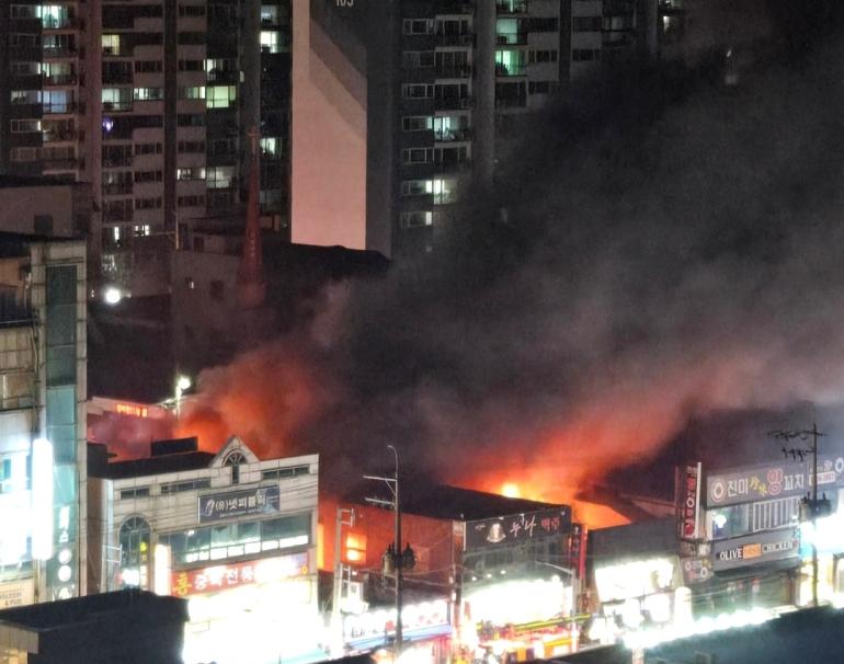 9일 오후 8시경 나운동 동백사거리 인근 상가 밀집지역에서 화재가 발생해 소방당국이 진화 작업을 벌이고 있다.