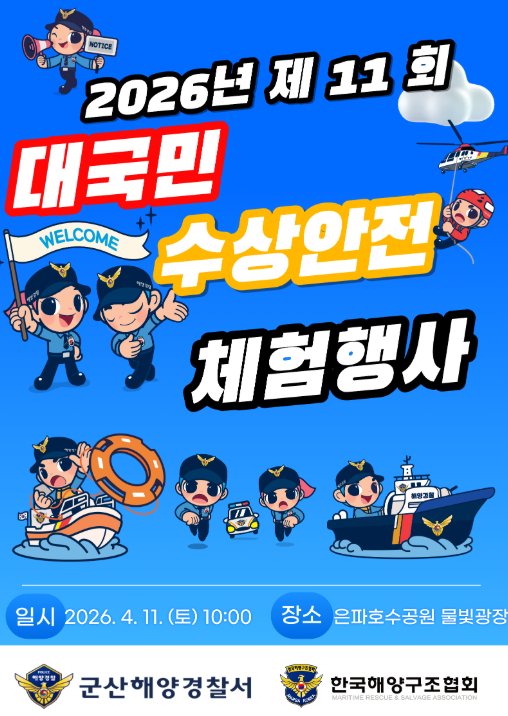 군산해경은 한국해양구조협회 전북북부지부와 함께 오는 4월 11일 오전 10시부터 은파호수공원 물빛광장에서 ‘제11회 대국민 수상안전 체험행사’를 연다. 이번 행사는 군산시를 비롯한 해양안전 관련 기관과 단체들이 참여해 공동으로 준비했으며, 시민 누구나 쉽게 참여할 수 있는 체험형 프로그램 중심으로 구성됐다.