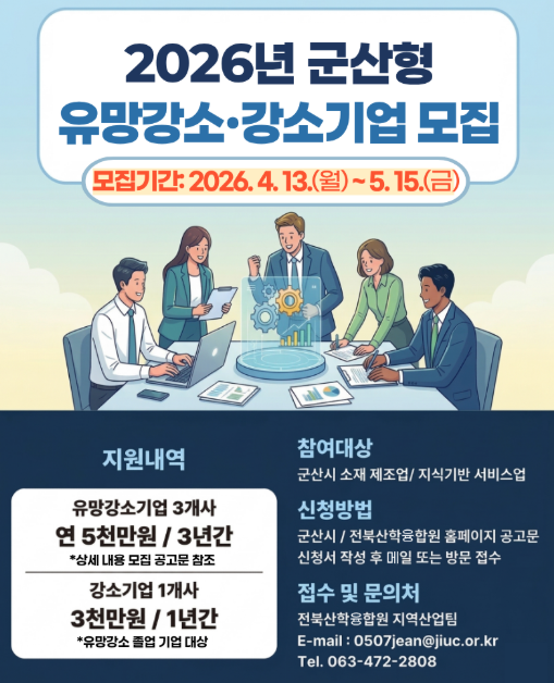 군산시가 지역 경제를 이끌 성장형 중소기업 발굴에 나섰다. 시는 오는 5월 15일까지 ‘2026년 군산형 유망 강소 및 강소기업’ 참여 기업을 모집한다고 13일 밝혔다.