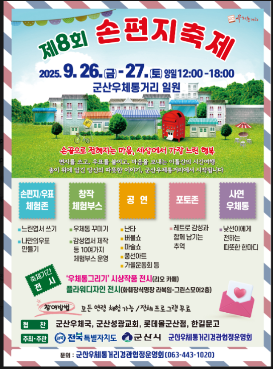 가을 정취 속에서 손편지의 따뜻한 감성을 되새기는 축제가 군산에서 펼쳐진다. 올해로 8회를 맞은 ‘군산우체통거리 손편지축제’가 오는 9월 26일부터 27일까지 이틀간 군산우체통거리 일대에서 열린다.