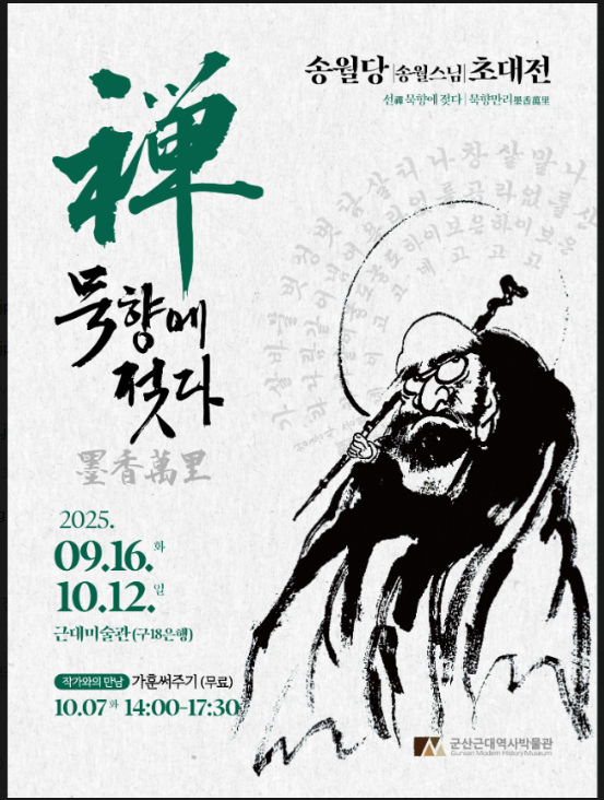 군산근대미술관이 송월 스님의 초대전 ‘선(禪) 묵향에 젖다 – 묵향만리(墨香萬里)’를 연다. 전시는 오는 9월 16일부터 10월 12일까지 구 18은행 건물에 위치한 근대미술관에서 열리며, 불경과 달마, 나한을 주제로 한 서예 작품 40여 점이 선의 세계로 안내한다.