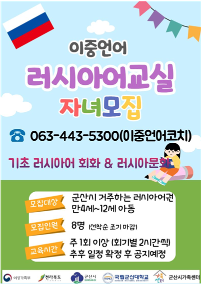 국립군산대학교가 수탁 운영하는 군산시가족센터(센터장 조경신)는 오는 11월 중 러시아어권 다문화가정 자녀를 대상으로 ‘이중언어 러시아어 교실’을 개강, 참여자를 모집한다.