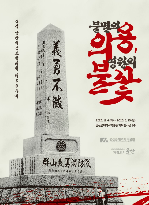 군산근대역사박물관이 순직 의용소방대원 9인을 기리는 기획전 《불멸의 의용, 영원의 불꽃》을 열고, 80년 전 공동체를 지키기 위해 불길에 뛰어든 대원들의 헌신과 그 정신이 이어져온 역사를 조명한다. 이번 전시는 4일부터 2026년 3월 29일까지 의용소방대원의 희생과 추모의 역사를 총 5부 구성으로 풀어낸다.