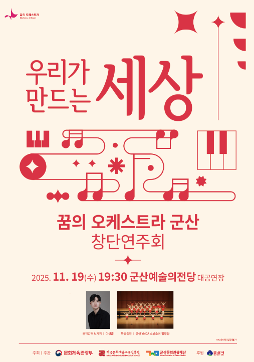 이번 창단연주회는 단원들이 지난 1년간 배우고 쌓아온 음악적 성취를 선보이는 자리로, 이날 연주회에서는 ▲페르귄트 모음곡 ▲해리 포터 OST ▲차이콥스키 교향곡 제5번 4악장 ▲징글벨 ▲고요한 밤 등 총 9곡이 연주되며, 다양한 장르와 연령대가 공감할 수 있는 레퍼토리로 구성됐다. 특히 군산 YMCA 소년소녀합창단과의 협연을 통해 무대의 풍성함과 감동을 더할 예정이다.