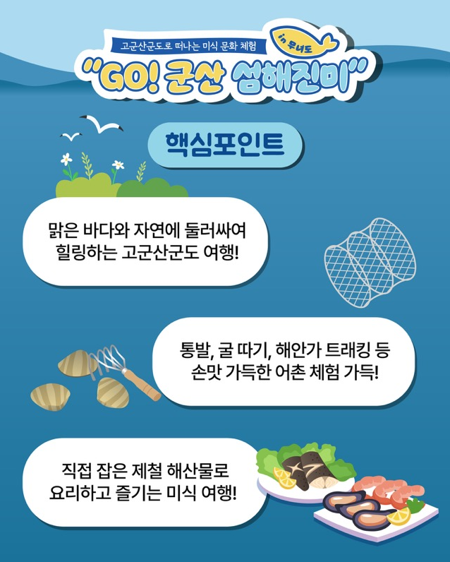 ‘섬해진미’는 군산 최초의 1박 2일 체류형 미식관광 프로그램으로, 올해 초 전북 미식관광활성화 공모사업에 선정되며 체계성과 가능성을 인정받았다.