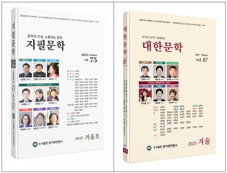 종합문예지 지필문학 통권 제75호와 대한문학 통권 제87호 겨울호가 출간됐다. 두 문예지는 연말을 맞아 각 부문 문학상 및 신인문학상 수상자를 발표하며, 오는 13일 오후 2시 군산 장미공연장(군산근대역사박물관 옆)에서 출판기념회와 시상식을 개최한다.