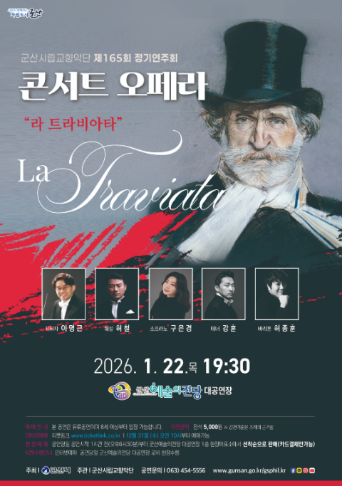 군산시립교향악단이 희망찬 새해를 맞아 오는 1월 22일 오후 7시 30분, 군산예술의전당 대공연장에서 제165회 정기연주회 콘서트 오페라 ‘라 트라비아타를 선보인다.