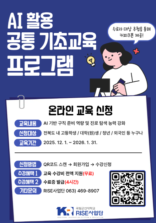 국립군산대학교 RISE사업단은 7일 전북특별자치도 내 고등학생, 대학(원)생, 청년, 외국인 등 누구나 참여할 수 있는 ‘온라인 기반 AI 활용 공통 기초교육 프로그램’을 개설했다고 밝혔다.