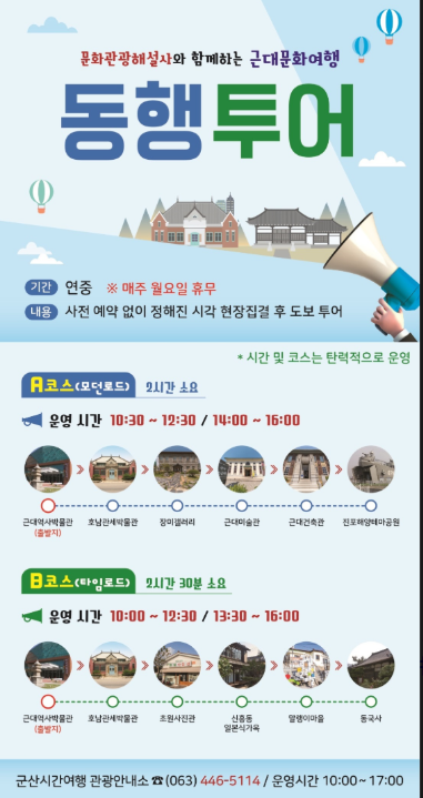 특히 어떤 코스를 선택하든 군산 근대문화 유산 관광의 랜드마크인 군산근대역사박물관과 호남관세박물관(옛 군산세관)을 관람할 수 있는 완성도 있는 코스를 마련해 이용자의 편의를 배려했다. 해설 시간은 오전과 오후로 나눠지며 모던로드 (오전 10시 30분~오후 12시 30분·오후 2시~4시), 타임로드(오전 10시~오후 12시 30분· 오후 1시 30분~4시)로 운영된다. 단, 매주 월요일은 휴무다.