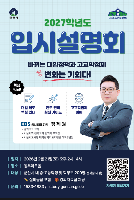 군산시가 변화하는 대입 정책과 고교학점제에 대한 학생·학부모의 이해를 돕기 위해 21일 오후 2시 동우아트홀에서 ‘2027학년도 입시설명회’를 개최한다.