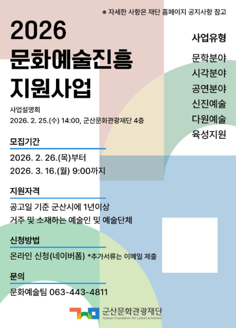 접수 기간은 2월 26일부터 3월 16일 오전 9시까지, 신청은 온라인으로 진행되며 작성한 지원 신청서와 증빙 서류는 별도 이메일로 제출하면 된다. 공모와 관련한 세부 사항은 재단 누리집 공지사항에서 확인할 수 있으며, 문의는 문화예술팀(063-443-4811)으로 하면 된다.