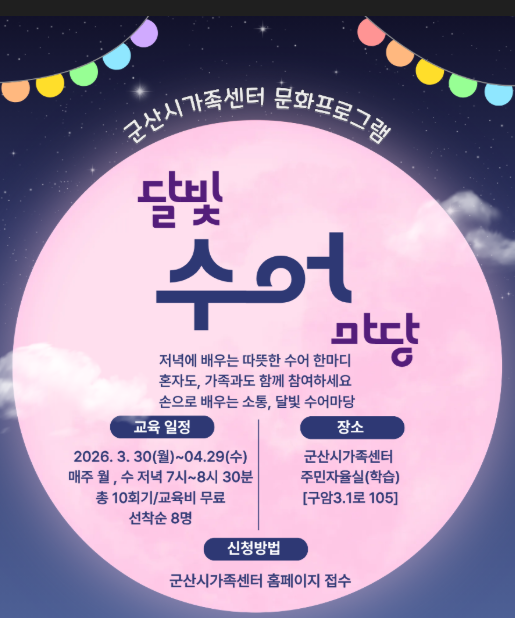 군산시가족센터(센터장 조경신)가 군산 시민과 가족을 대상으로 올해 첫 문화 프로그램인 ‘달빛 수어마당’ 초급반을 운영한다.