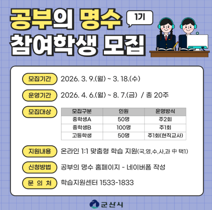 군산시가 지역 학생들의 학습 격차를 줄이고 맞춤형 학습 지원을 강화하기 위해 ‘공부의 명수’ 온라인 튜터링 1기 참여 학생 모집에 나섰다. 이번 온라인 튜터링은 관내 중·고등학생을 대상으로 진행되는 1대1 맞춤형 학습 프로그램으로, 교과 중심의 학습 지도를 통해 학생들의 자기주도 학습 역량을 높이기 위해 마련됐다.