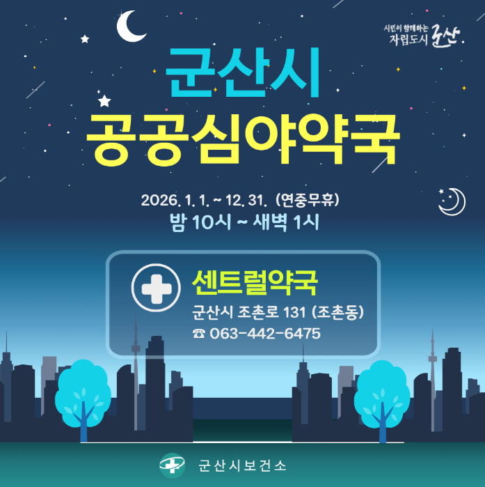 공공심야약국(센트럴약국, 군산시 조촌로 131, ☎ 063-442-6475)은 오후 10시부터 다음날 새벽 1시까지 365일(연중무휴) 운영되며, 심야시간대에도 약사와의 상담을 통해 안전한 의약품 복용이 가능하도록 지원하고 있다.