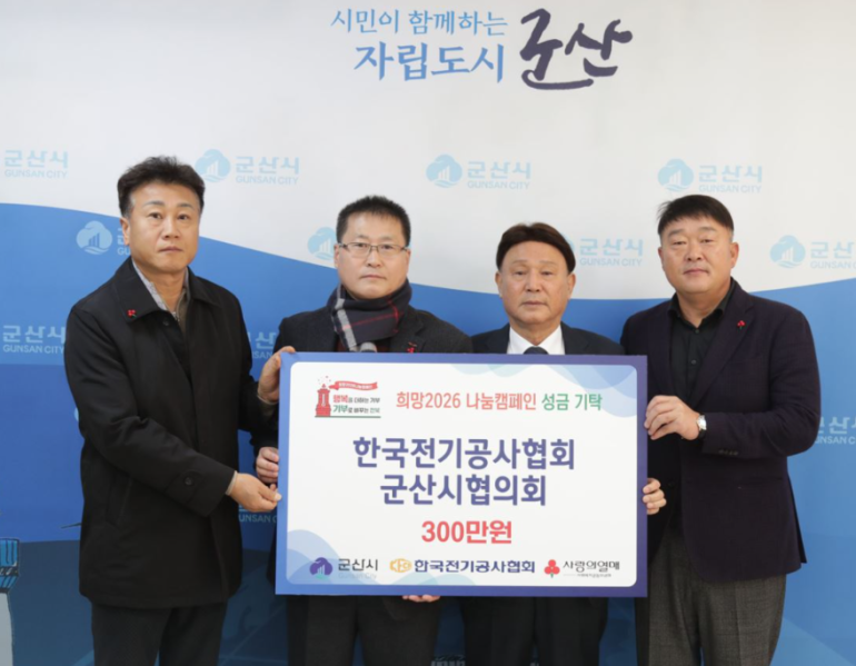 29일 한국전기공사협회 군산시협의회는 연말연시 어려운 이웃들을 돕는데 써달라며 성금 300만 원을 군산시에 기탁했다. 이번에 기탁된 성금은 관내 취약계층과 사회복지시설 및 단체에 전달되어 추운 겨울철 도움의 손길이 필요한 이웃들에게 따뜻한 희망이 될 예정이다.