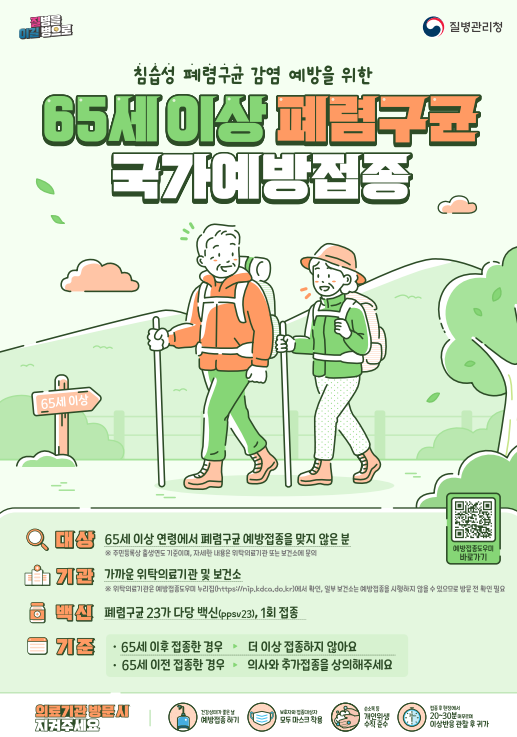 폐렴은 국내 사망 원인 중 높은 비중을 차지하는 질환이지만 65세 이상 연령대에서 평생 단 1회 접종만으로도 폐렴구균에 의한 침습성 감염증(패혈증, 뇌수막염 등)을 50~80%까지 효과적으로 예방할 수 있어 적기 접종이 무엇보다 중요하다.