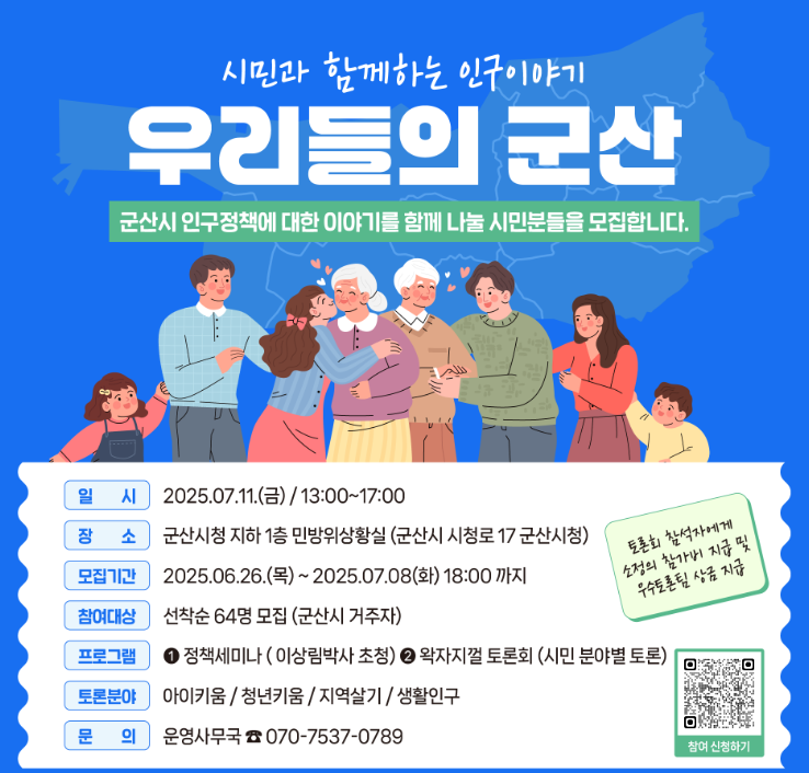 시민토론회 참여 대상은 군산시에 거주하는 시민으로 선착순 모집하며, 신청은 7월 8일까지, 포스터 내 QR 부호(코드)를 통해 온라인으로 가능하다.