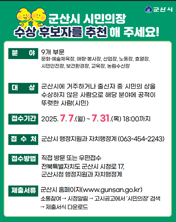 접수는 후보자의 추천서, 공적조서, 공적 증명서류 등을 갖춰 7월 31일까지 군산시청 행정지원과를 방문하거나 우편으로 제출해야 한다.