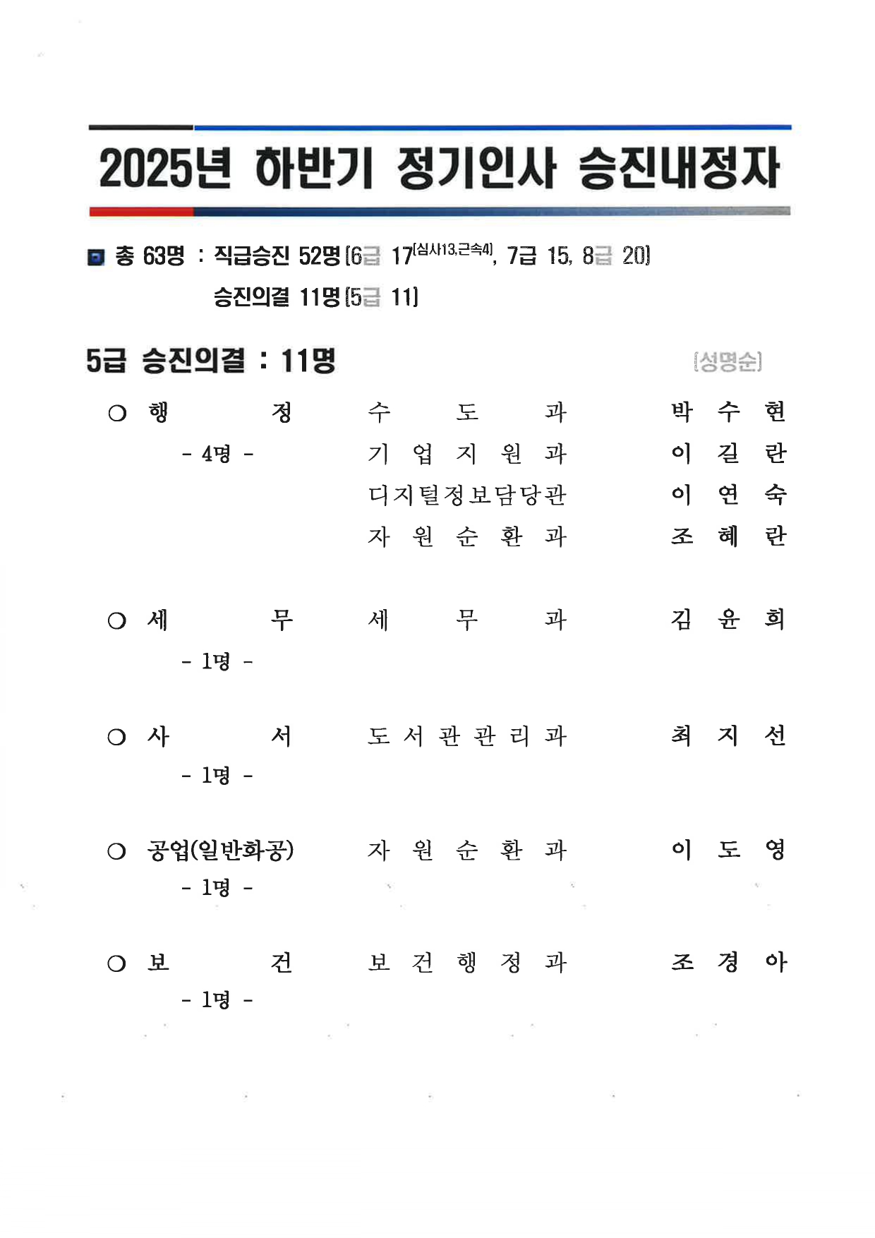 군산시는 2025년 하반기 정기인사를 7월 8일자로 단행하며, 총 63명의 승진 내정자를 발표했다.