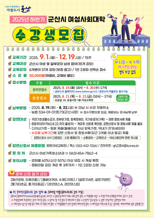 군산시 여성사회대학이 오는 8월 19일부터 22일까지 하반기 프로그램 수강생을 선착순 모집한다.