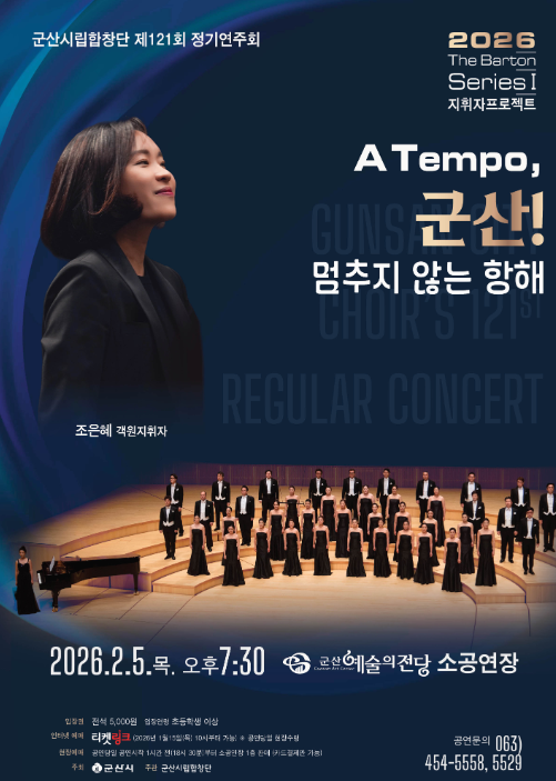 공연은 2월 5일 오후 7시 30분 군산예술의전당 소공연장에서 열리며, 8세 이상 관람 가능하다. 입장권은 전석 5,000원(할인 2,500원)으로, 15일 오전 10시부터 티켓링크를 통해 예매할 수 있다. 공연 관련 문의는 군산시립합창단(063-454-5558)으로 하면 된다.