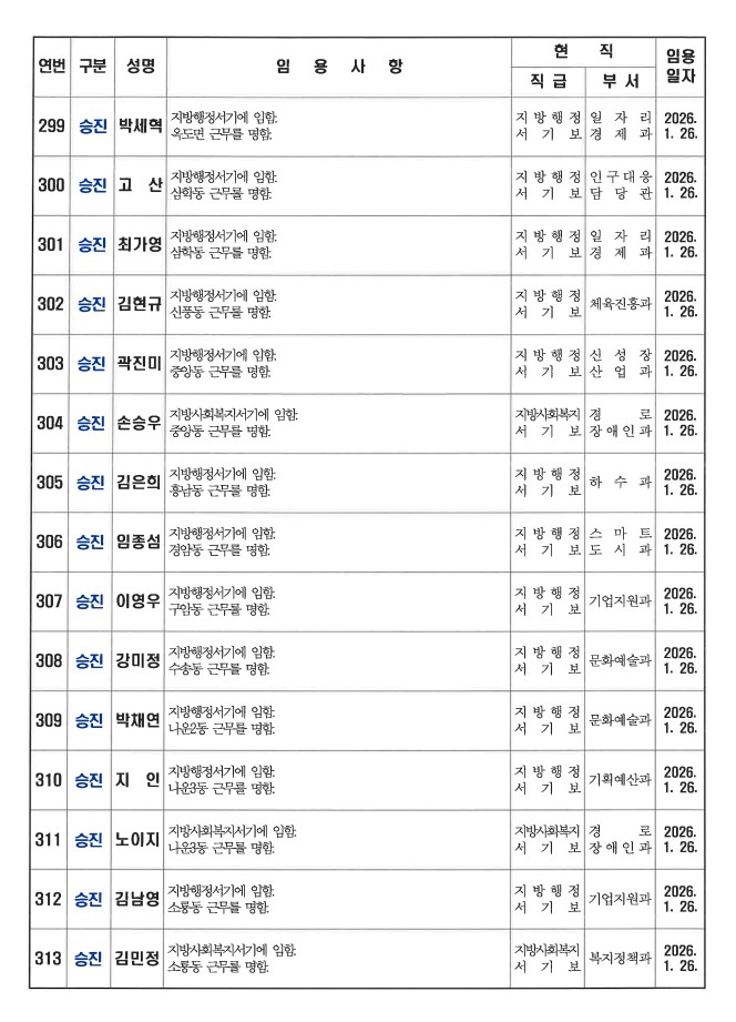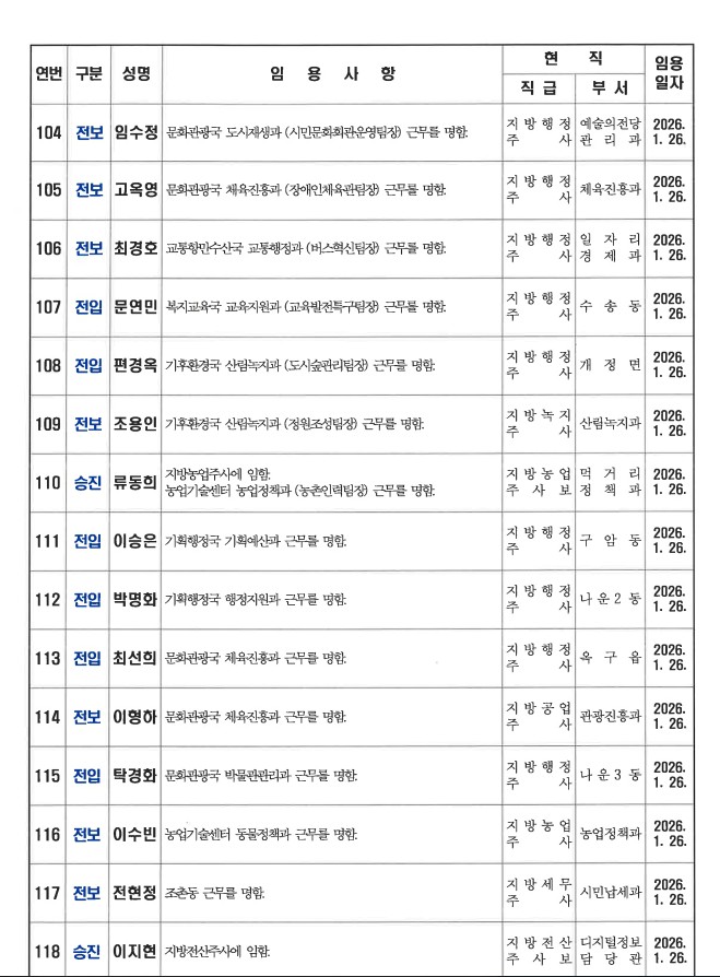 군산시가 1월 26일자 상반기 정기인사를 발표했다. 인사명단은 다음과 같다.