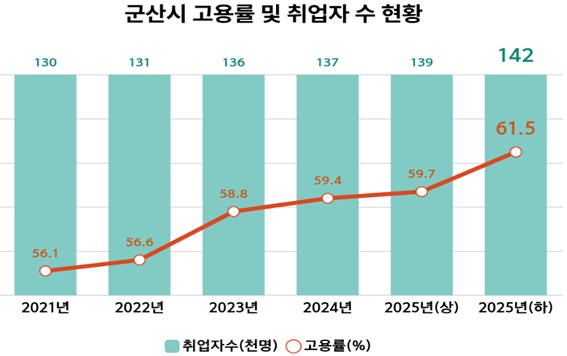 국가데이터처 지역별 고용조사에 따르면 2025년 하반기 군산시 고용률은 61.5%로 전년 동기 대비 2.1%p 상승했다. 취업자 수는 5,000명 증가한 14만2,000명으로 집계됐다.
