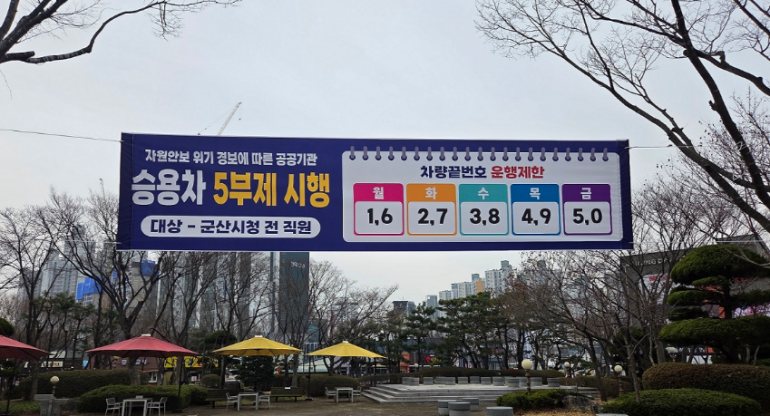 군산시가 정부의 자원안보 위기 주의단계 발령에 따라 에너지 절약을 위한 공공부문 대응으로 공공기관 승용차 5부제(요일제)를 본격 시행한다.
