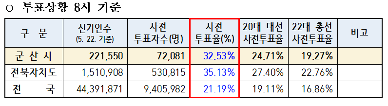 전북 전체 사전투표율은 35.13%, 전국 평균은 21.19%, 군산은 도내 평균에는 다소 못 미치지만, 전국 평균보다는 11%p 이상 높은 참여율을 기록하며 이번 선거에서 뚜렷한 존재감을 보이고 있다.