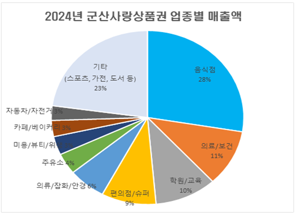 가맹점 매출 분석에 따르면, 군산사랑상품권은 식음료, 생활잡화, 서비스 업종 등 다양한 분야에서 소비되며 지역 전반에 고르게 긍정적인 영향을 미친 것으로 보인다.