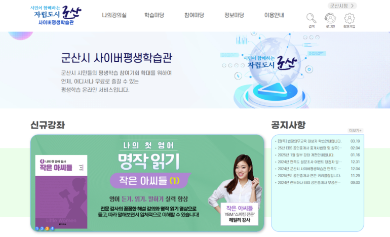 한편 수강 신청 방법은 군산시평생학습정보망(lll.gunsan.go.kr)에서 회원가입 후 메인화면에 ‘사이버평생학습관 바로가기(cyberedu.gunsan.go.kr)’ 또는 군산시 사이버평생학습관을 검색해 들어가면 된다. 자세한 사항은 군산시평생학습정보망을 참고하거나, 군산시청 교육지원과 평생교육계(063-454-2607)로 문의하면 된다.